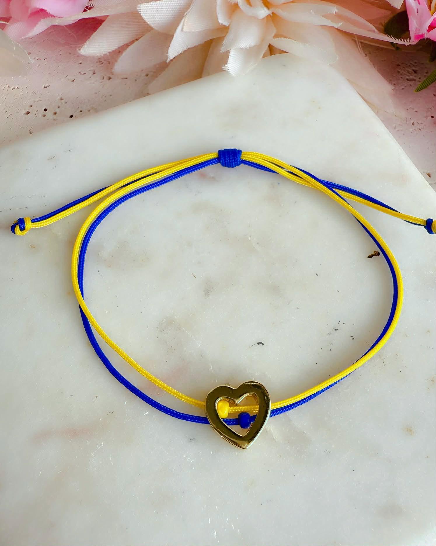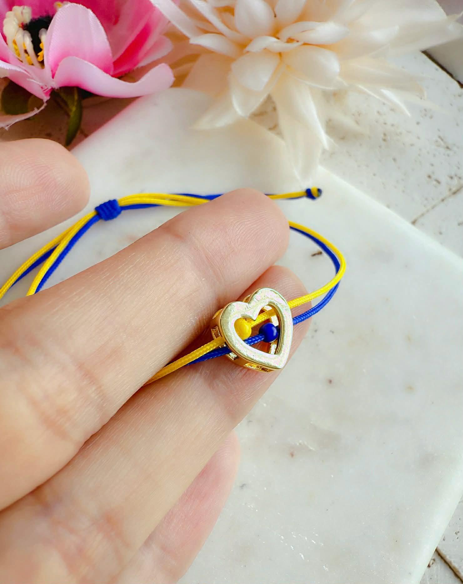 This bracelet is inspired by the colors of the Ukrainian flag and carefully handmade with an 11 mm brass heart plated in long-lasting 18K gold. Inside the heart, two blue and yellow glass stones create a clean, bright accent that gives the piece its distinctive look.