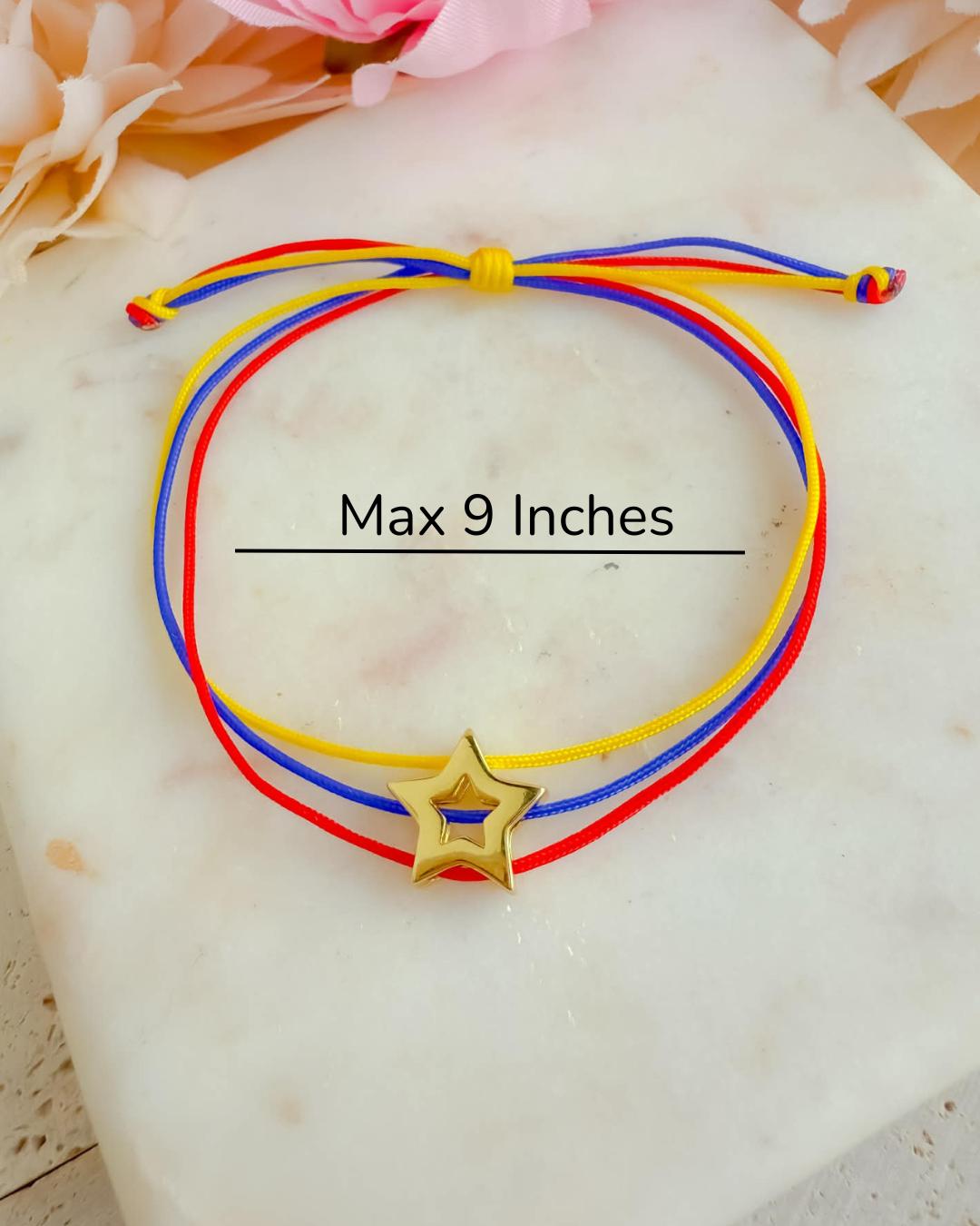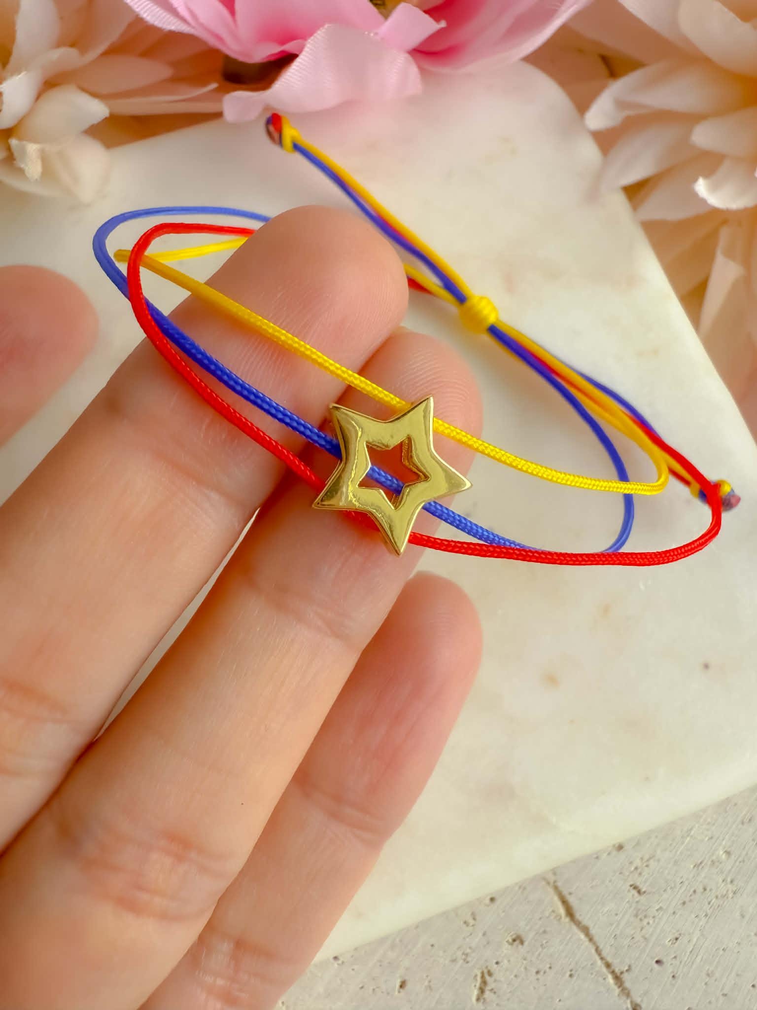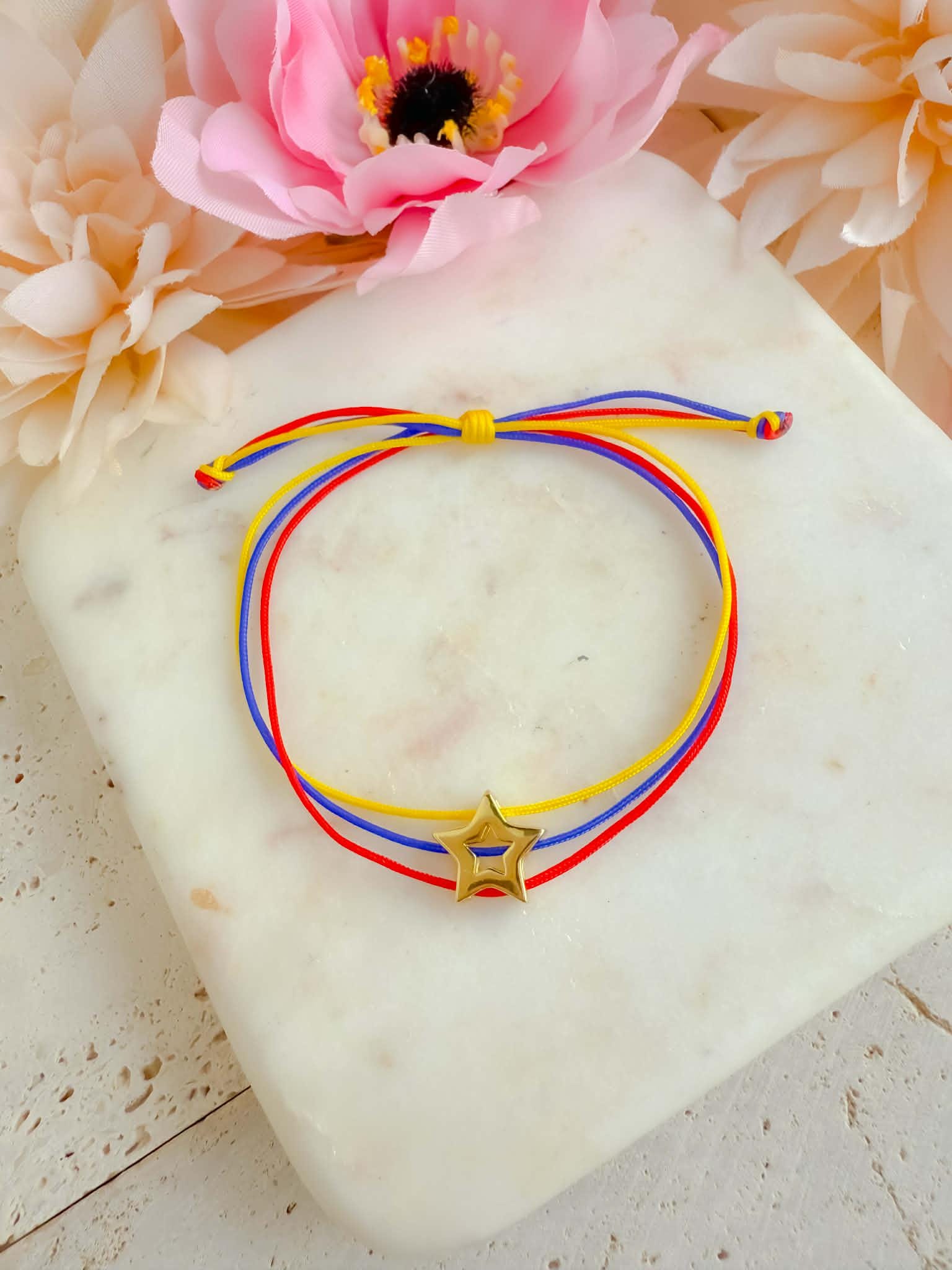 A delicate handmade bracelet inspired by the colors of the Venezuelan flag. Designed with a thin 0.8 mm nylon cord and an adjustable sliding knot that fits most wrists up to 9 inches. The star slider charm is brass with 18K gold plating for a bright and elegant touch.