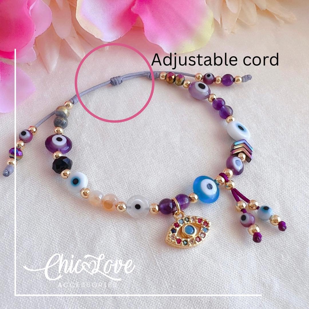 💎 The bracelet is handmade using a gray adjustable nylon cord and features natural stones, lampwork evil eye beads and 18K gold plated details.